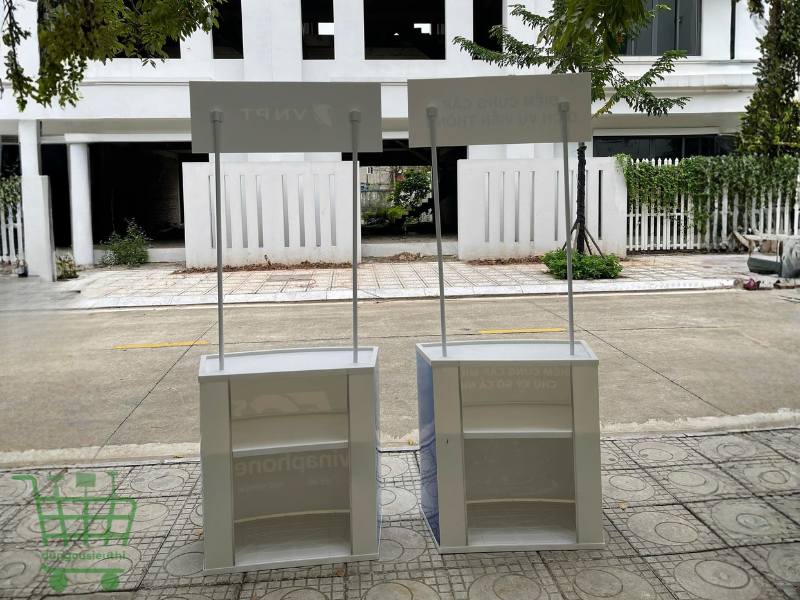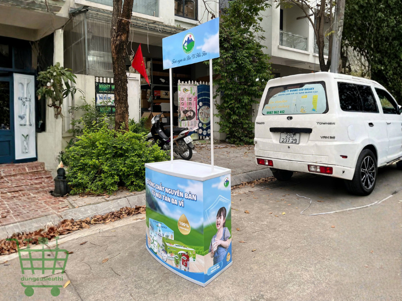 Booth sampling siêu thị thường có mặt bàn khoảng 0.4m x 0.8m và chiều cao tổng thể khoảng 1m95 khi gắn bảng hiệu.