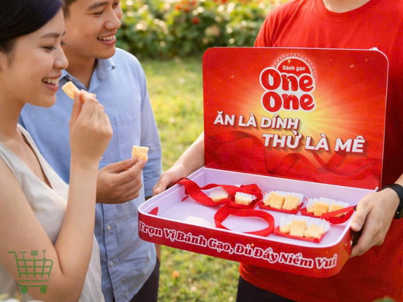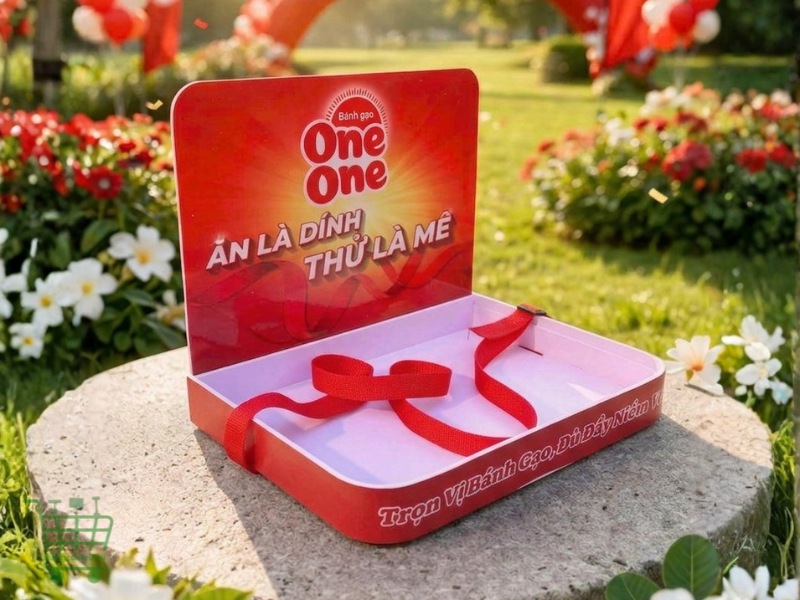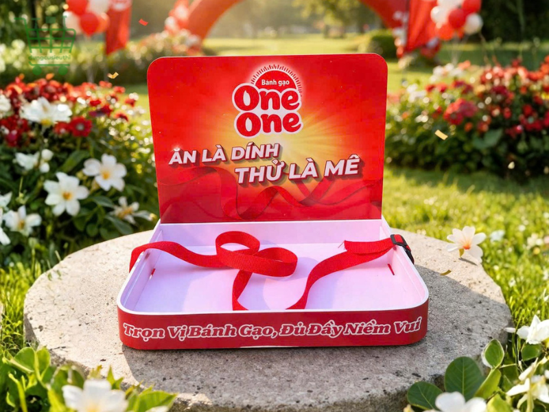 Điểm mạnh là bạn không cần đặt riêng theo từng sản phẩm, mà có thể sử dụng một mẫu khay cho nhiều chiến dịch khác nhau, từ bánh gạo đến snack, đồ ăn vặt hoặc sản phẩm dùng thử khác.