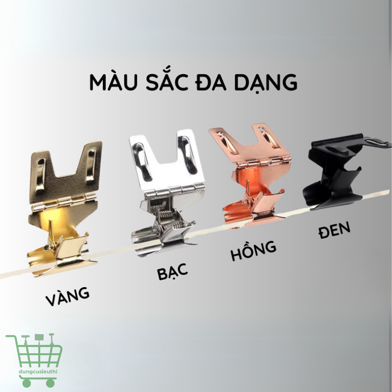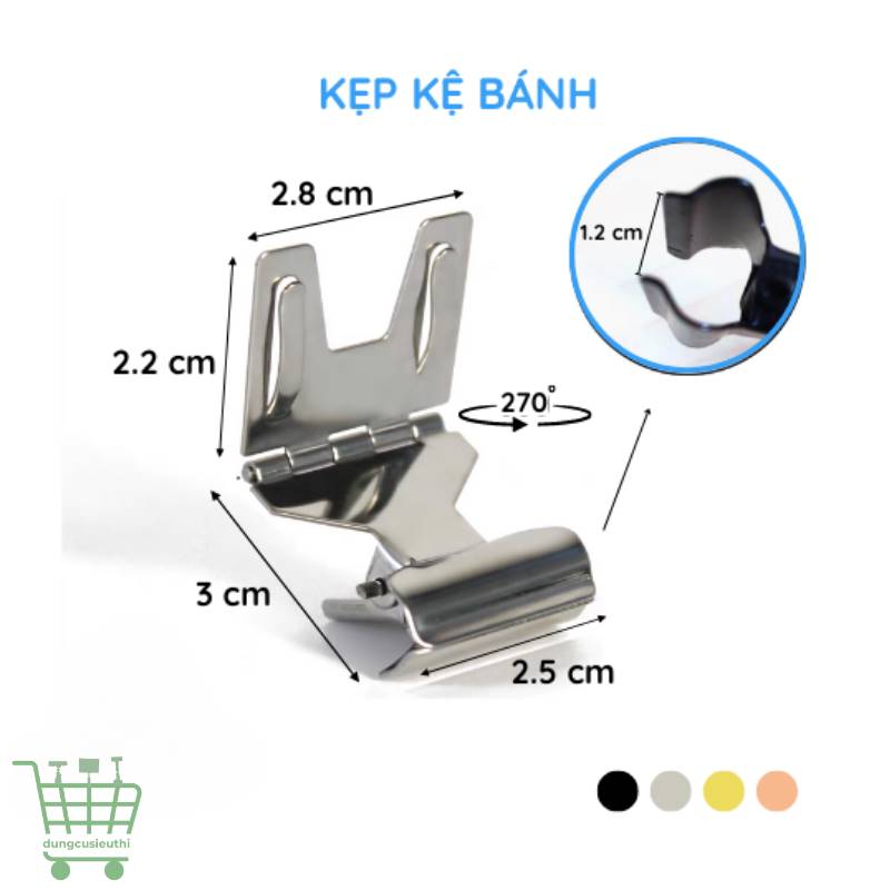 Kẹp kệ bánh nhỏ có kích thước chỉ 5.2 × 2.8 cm, nhỏ gọn và dễ dàng đặt trên kệ, bàn tiệc hay quầy hàng mà không chiếm nhiều diện tích. Sản phẩm có đa dạng màu sắc: bạc, đen, hồng, vàng, phù hợp nhiều phong cách trưng bày và tạo điểm nhấn nổi bật cho sản phẩm.