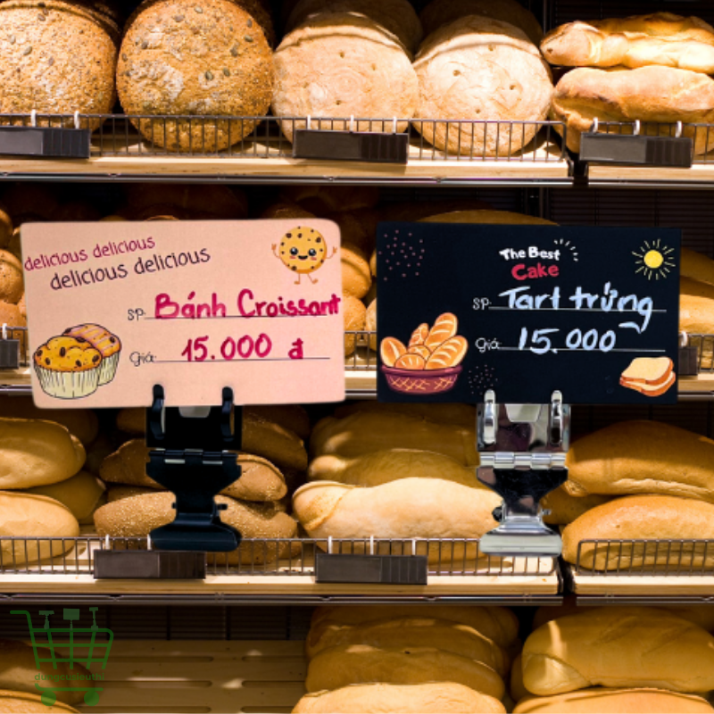 Kẹp kệ bánh nhỏ – Giải pháp trưng bày bảng tên và giá sản phẩm linh hoạt
