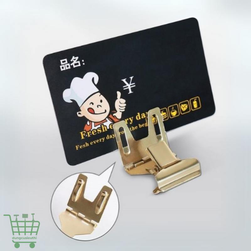 Kẹp kệ bánh nhỏ, hay còn gọi là kẹp tag nhỏ, là phụ kiện trưng bày chuyên dụng giúp hiển thị bảng tên, giá sản phẩm hoặc thông tin khuyến mãi một cách rõ ràng, tinh tế và chuyên nghiệp. Sản phẩm phù hợp cho quầy bánh, nhà hàng, khách sạn, sự kiện và nhiều không gian trưng bày khác.