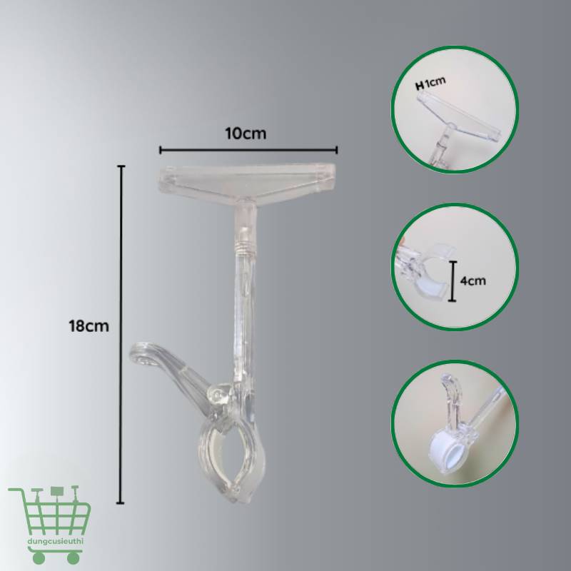 Kẹp mica có kích thước 18 × 10 cm, với ngàm kẹp mở rộng tối đa 4 cm, phù hợp cho các bảng giá từ A3 đến A6. Đầu kẹp có khe gắn bảng rộng 1 cm, giúp cố định chắc chắn bảng giá mà không bị xô lệch.