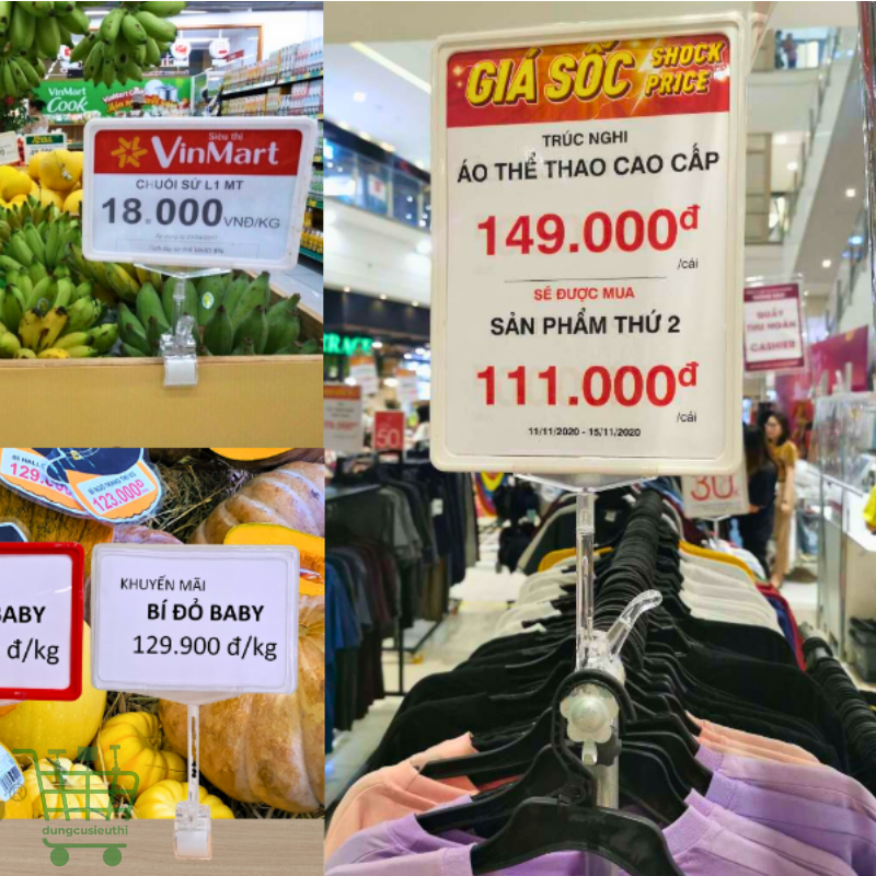 Ứng dụng: Kẹp mica dùng để treo bảng giá, biển sale, thông tin sản phẩm tại các cửa hàng, siêu thị, quầy bán lẻ. Sản phẩm giúp thông tin hiển thị rõ ràng, thu hút khách hàng và dễ dàng thay đổi nội dung khi cần. Đây là giải pháp trưng bày hiện đại, tiết kiệm diện tích và chi phí, tối ưu hóa hiệu quả quảng cáo tại điểm bán.