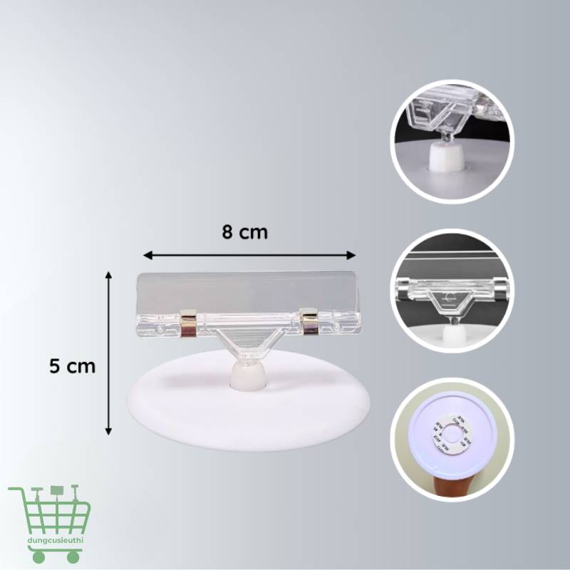Được làm từ nhựa ABS cao cấp, kẹp có độ bền cao, chịu lực tốt, ít bám bụi và dễ vệ sinh. Thiết kế trong suốt, tinh tế giúp hài hòa với mọi không gian trưng bày, mang lại vẻ hiện đại và chuyên nghiệp. Kẹp có kích thước 5×8 cm, đế tròn đường kính 9 cm, nhỏ gọn nhưng chắc chắn. Phần khớp xoay 180 độ giúp dễ dàng điều chỉnh hướng nhìn, tối ưu khả năng hiển thị thông tin.
