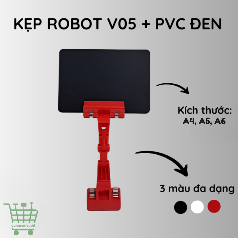 Kẹp wobbler robot V05 là dụng cụ trưng bày tiện lợi, giúp hiển thị bảng giá, thông tin sản phẩm, khuyến mãi hoặc thẻ quảng cáo một cách rõ ràng và nổi bật. Với thiết kế thông minh bao gồm 3 khớp xoay linh hoạt, sản phẩm cho phép điều chỉnh nhiều góc nhìn, phù hợp sử dụng tại quầy trưng bày, kệ hàng, bàn thu ngân, hoặc các khu vực giới thiệu sản phẩm.