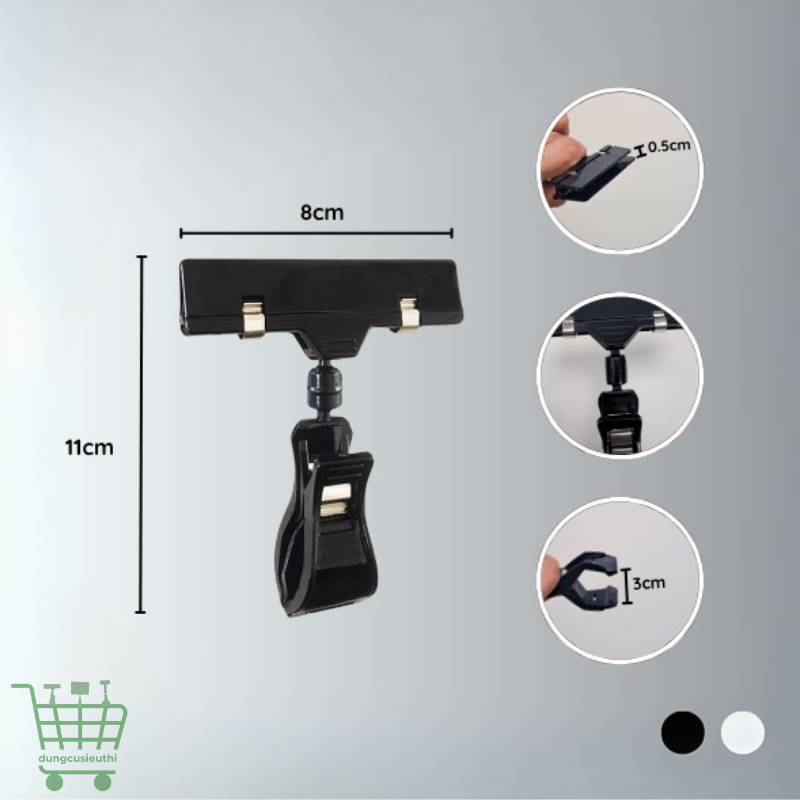 Sản phẩm có kích thước 11×8 cm, ngàm kẹp mở rộng tối đa 3 cm, dễ dàng kẹp được nhiều loại bảng hoặc thẻ có độ dày khác nhau. Thiết kế khớp nối xoay 360 độ, cho phép điều chỉnh góc nhìn tùy ý, giúp nội dung hiển thị luôn hướng đúng tầm mắt khách hàng. Wobbler V06 có hai màu sắc là đen và trong suốt, dễ dàng lựa chọn để phù hợp với phong cách trưng bày và nhận diện thương hiệu của cửa hàng.