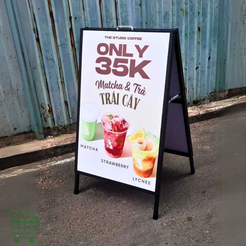 Không chỉ là công cụ trưng bày thông tin, standee chữ A 2 mặt bằng sắt còn là giải pháp quảng cáo tiện lợi – bền vững – thẩm mỹ, giúp bạn tối ưu không gian, tiết kiệm chi phí và nâng cao hình ảnh thương hiệu trong mọi chiến dịch truyền thông.