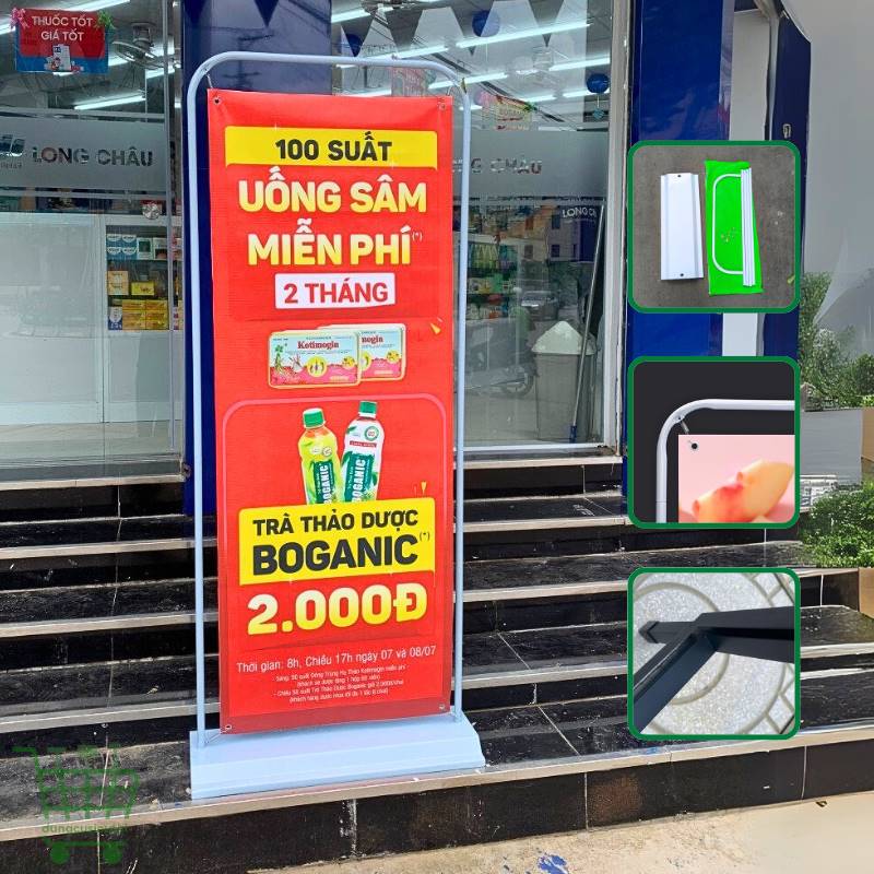 Khung standee được làm hoàn toàn từ sắt sơn tĩnh điện, giúp chống gỉ sét, chịu lực tốt và giữ màu bền đẹp theo thời gian. Phần chân đế rộng kiểu cửa giúp standee đứng vững ngay cả trong môi trường gió lớn, hạn chế rung lắc khi sử dụng ngoài trời. Sản phẩm đi kèm túi đựng chuyên dụng, tiện lợi khi di chuyển hoặc cất giữ.