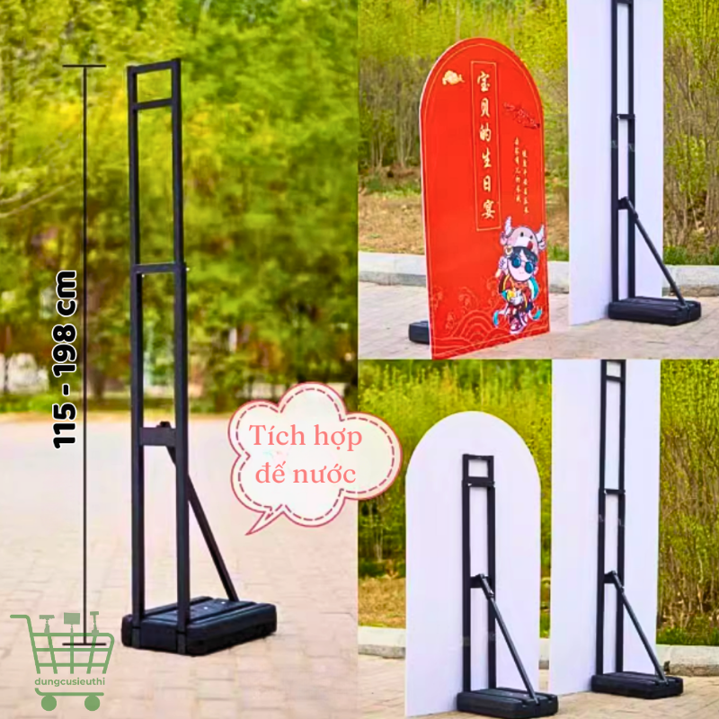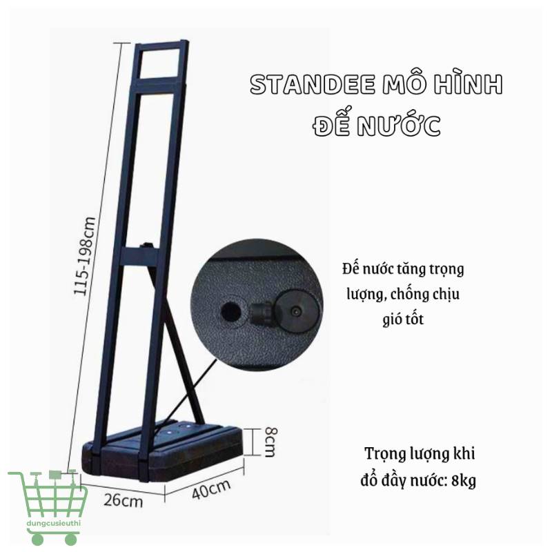 Khung standee mô hình đế nước được chế tạo từ sắt sơn tĩnh điện cao cấp, mang lại độ bền và tính ổn định cao khi sử dụng lâu dài. Chân đế được thiết kế rỗng, có thể đổ nước hoặc cát để tăng trọng lượng, giúp standee luôn đứng vững ngay cả trong môi trường ngoài trời có gió mạnh. Bề mặt in thường làm bằng fomex hoặc alu, hiển thị hình ảnh sắc nét, bền màu, phù hợp cho các chương trình quảng bá sản phẩm chuyên nghiệp.