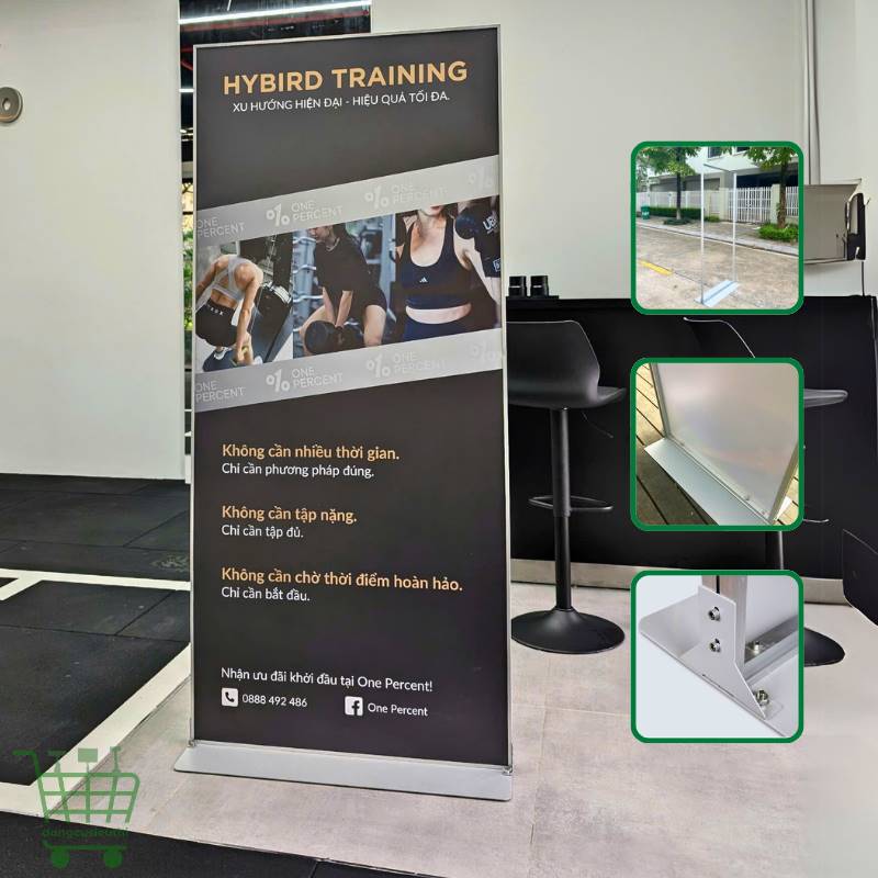 Khung standee nhôm chân đứng cao cấp được cấu tạo từ nhôm nguyên khối cao cấp, có khả năng chống ăn mòn và chịu lực tốt, mang lại độ bền vượt trội khi sử dụng lâu dài. Phần bề mặt in được dán trên fomex 5mm phủ bạt PP decal giúp hình ảnh hiển thị sắc nét, sống động và không bị cong vênh trong quá trình trưng bày. Thiết kế hai mặt hiển thị giúp standee dễ dàng thu hút ánh nhìn từ nhiều hướng, tăng hiệu quả quảng cáo vượt trội so với loại một mặt thông thường.