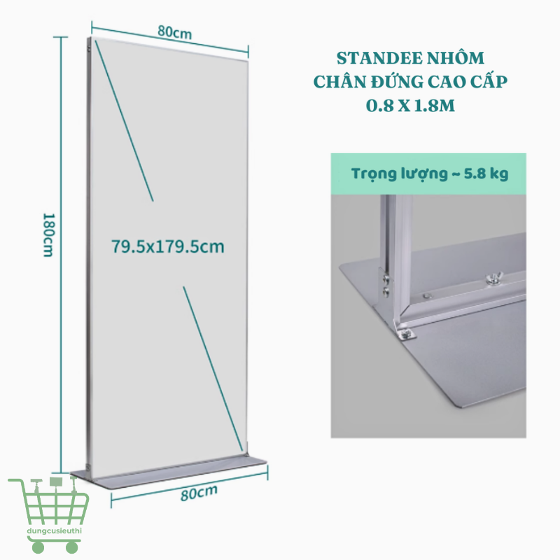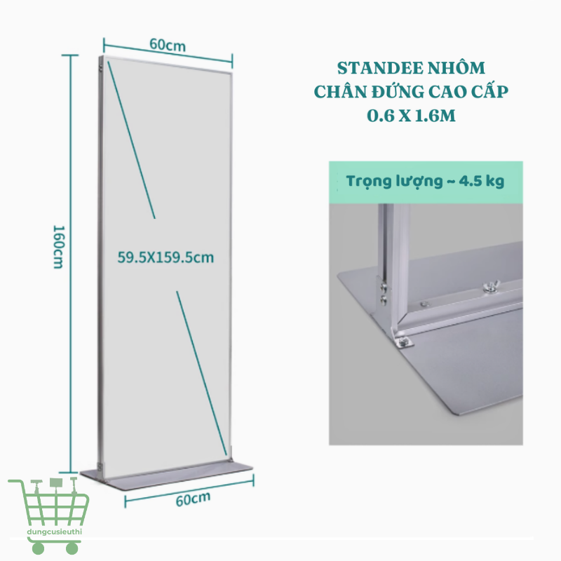 Trọng lượng: chỉ 4.5 – 5.8 kg, vừa đủ độ chắc chắn, đồng thời thuận tiện khi tháo lắp, di chuyển hoặc bảo quản. Với thiết kế chân đứng vững chắc, góc bo mềm mại và kết cấu cân đối, standee nhôm cao cấp mang đến vẻ ngoài chuyên nghiệp, giúp không gian trưng bày trở nên hiện đại và thu hút hơn. Sản phẩm có thể tái sử dụng nhiều lần, thay nội dung linh hoạt, rất phù hợp cho doanh nghiệp thường xuyên tổ chức chương trình quảng cáo hoặc sự kiện.