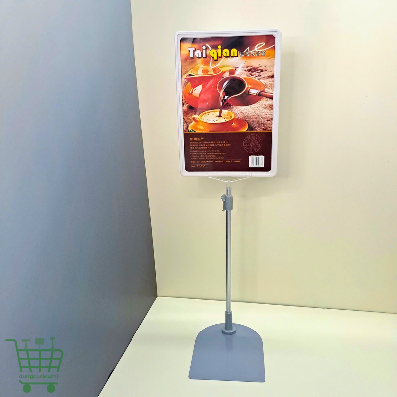Chân đế có kích thước điều chỉnh từ 38 – 60 cm, chân đế vuông 21 × 16 cm, vừa vững chắc vừa gọn gàng, phù hợp với nhiều kích thước khung bảng giá từ A3 đến A6. Trọng lượng 0.6 kg giúp dễ dàng di chuyển và lắp đặt mà không tốn nhiều diện tích.