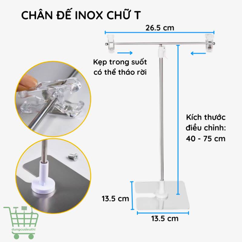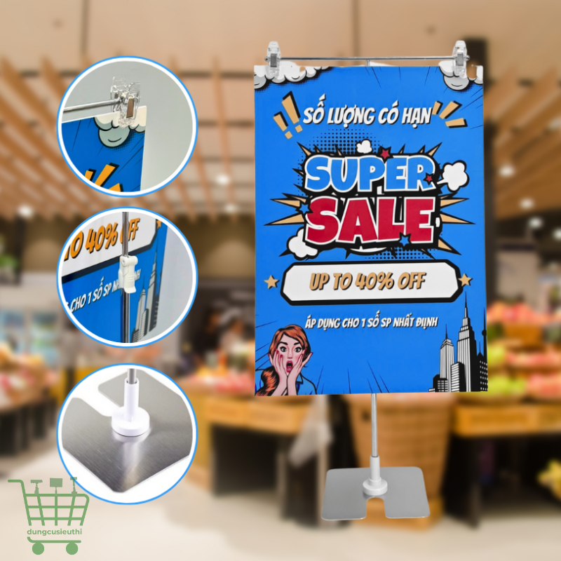 Kệ treo poster chữ T, hay còn gọi là giá treo inox chữ T, là phụ kiện trưng bày tiện lợi giúp cố định và hiển thị poster, bảng quảng cáo hoặc bảng thông tin một cách nổi bật. Với thiết kế tinh gọn, chiều cao điều chỉnh linh hoạt và chất liệu inox cao cấp, sản phẩm mang đến giải pháp trưng bày chuyên nghiệp, thẩm mỹ và tiết kiệm không gian cho cửa hàng, siêu thị, showroom, triển lãm và sự kiện.