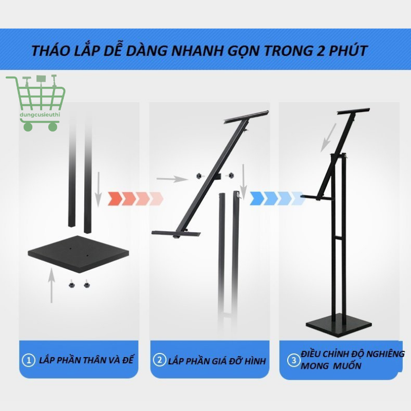 Khung kệ được làm từ sắt sơn tĩnh điện chắc chắn, kết hợp với tấm in PP bồi fomex 3–5mm, vừa vững chãi vừa tạo vẻ ngoài chuyên nghiệp. Sản phẩm còn được đóng gói trong hộp giấy tiện lợi, thuận tiện cho việc di chuyển, bảo quản và setup nhanh chóng tại nhiều địa điểm khác nhau.