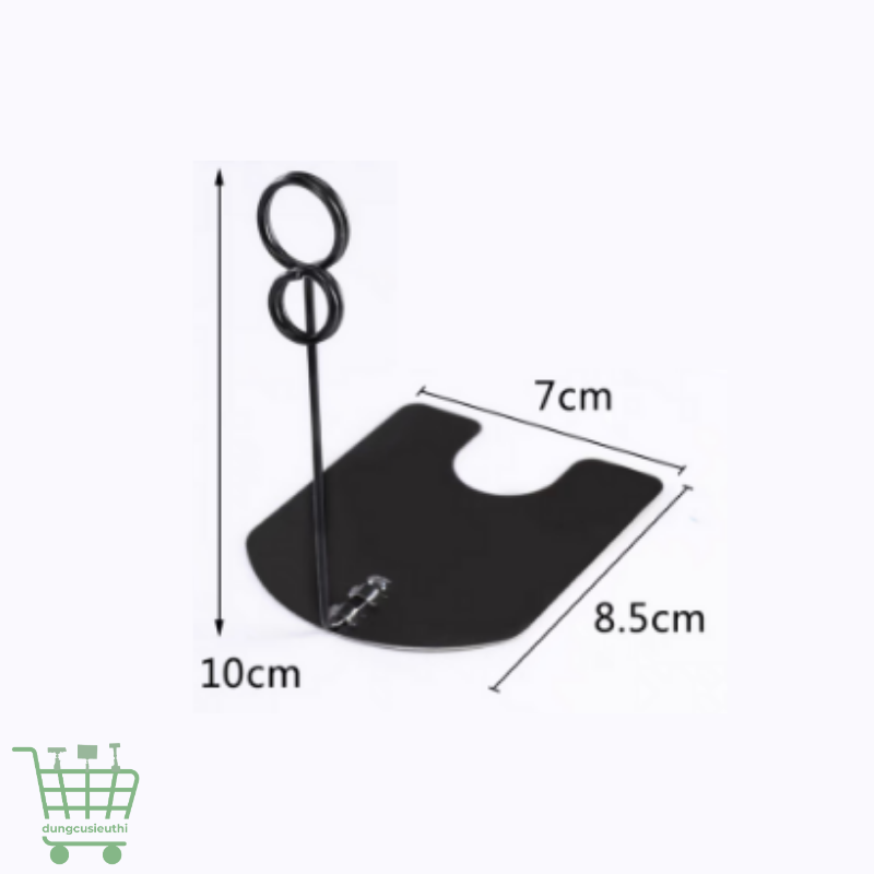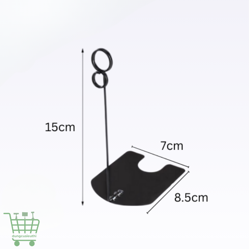 Kẹp inox số 8 đen có ba kích thước thân cao phổ biến: 5cm, 10cm và 15cm, với chân đế dài 8.5cm và rộng 7cm, đảm bảo sự vững chắc và ổn định khi trưng bày. Màu sắc đen bóng tạo điểm nhấn hiện đại, phù hợp phối cùng nhiều biển quảng cáo hoặc thẻ giá khác nhau.