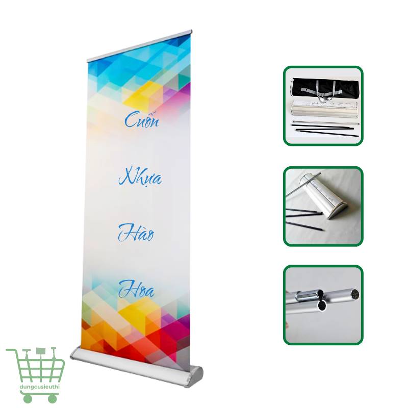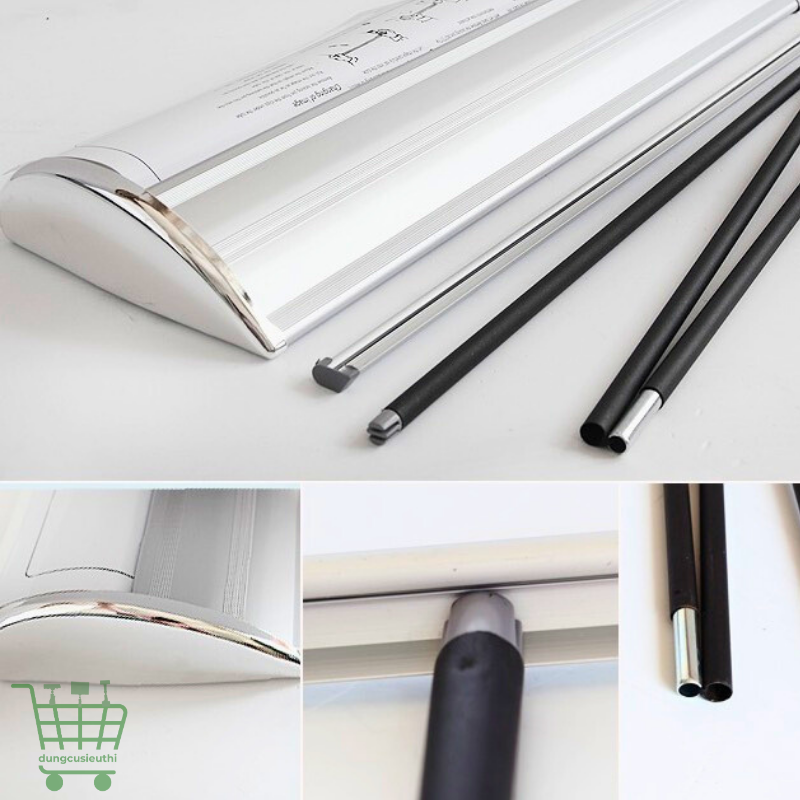 Khung standee cuốn nhựa hào hoa được chế tạo từ hộp cuốn nhựa cao cấp, có độ bền tốt, không bị cong vênh trong quá trình sử dụng. Thanh chống bằng sắt sơn tĩnh điện gấp 3 khúc giúp giữ banner căng phẳng, chắc chắn. Sản phẩm đi kèm túi đựng chuyên dụng, thuận tiện cho việc cất giữ và di chuyển.