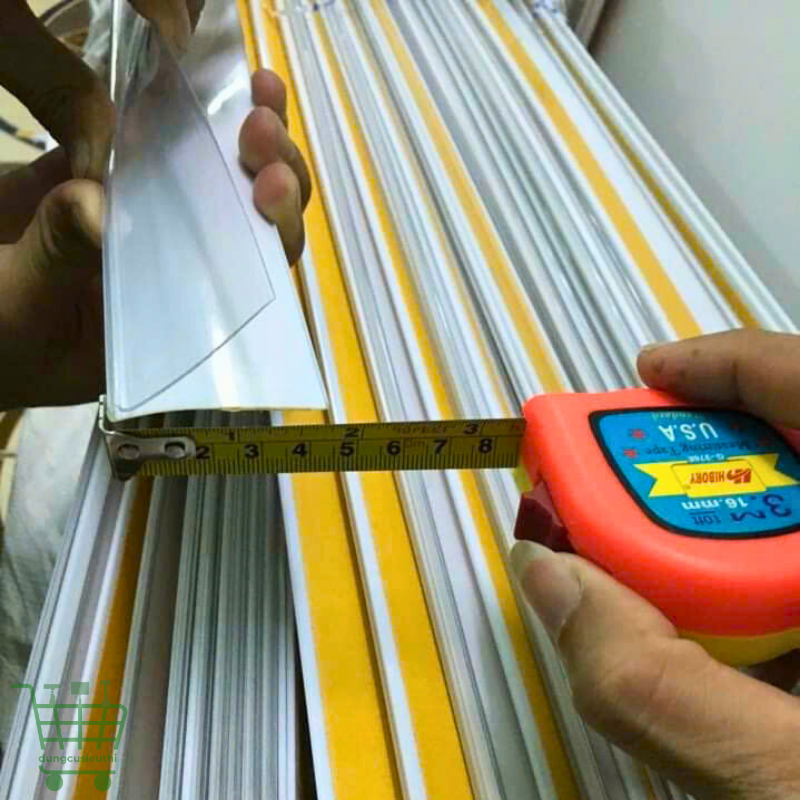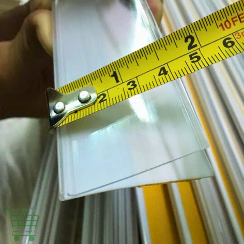 Sản phẩm có chiều cao 4.5cm, phù hợp với các loại tem giá tiêu chuẩn khoảng 4cm. Chiều dài 1m và 1.2m linh hoạt cho từng nhu cầu trưng bày, có thể dễ dàng cắt hoặc nối dài tùy theo độ rộng của kệ hàng. Thiết kế mặt trước hơi cong nhẹ giúp tem giá nằm gọn và dễ thay mới khi cần cập nhật thông tin.